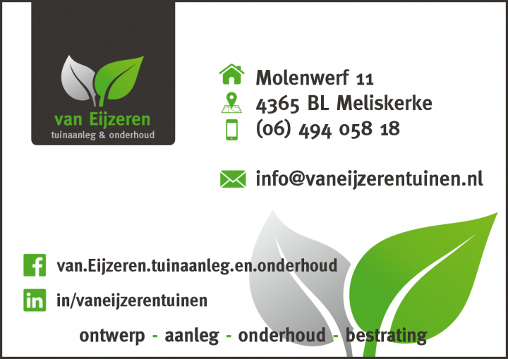 Van Eijzeren tuinaanleg en onderhoud is actief in de groene sector! Mijn streven is om mensen plezier aan de tuin te laten beleven. Zowel thuis, bij het werk of bij een recreatiewoning! Groen moet het doen!